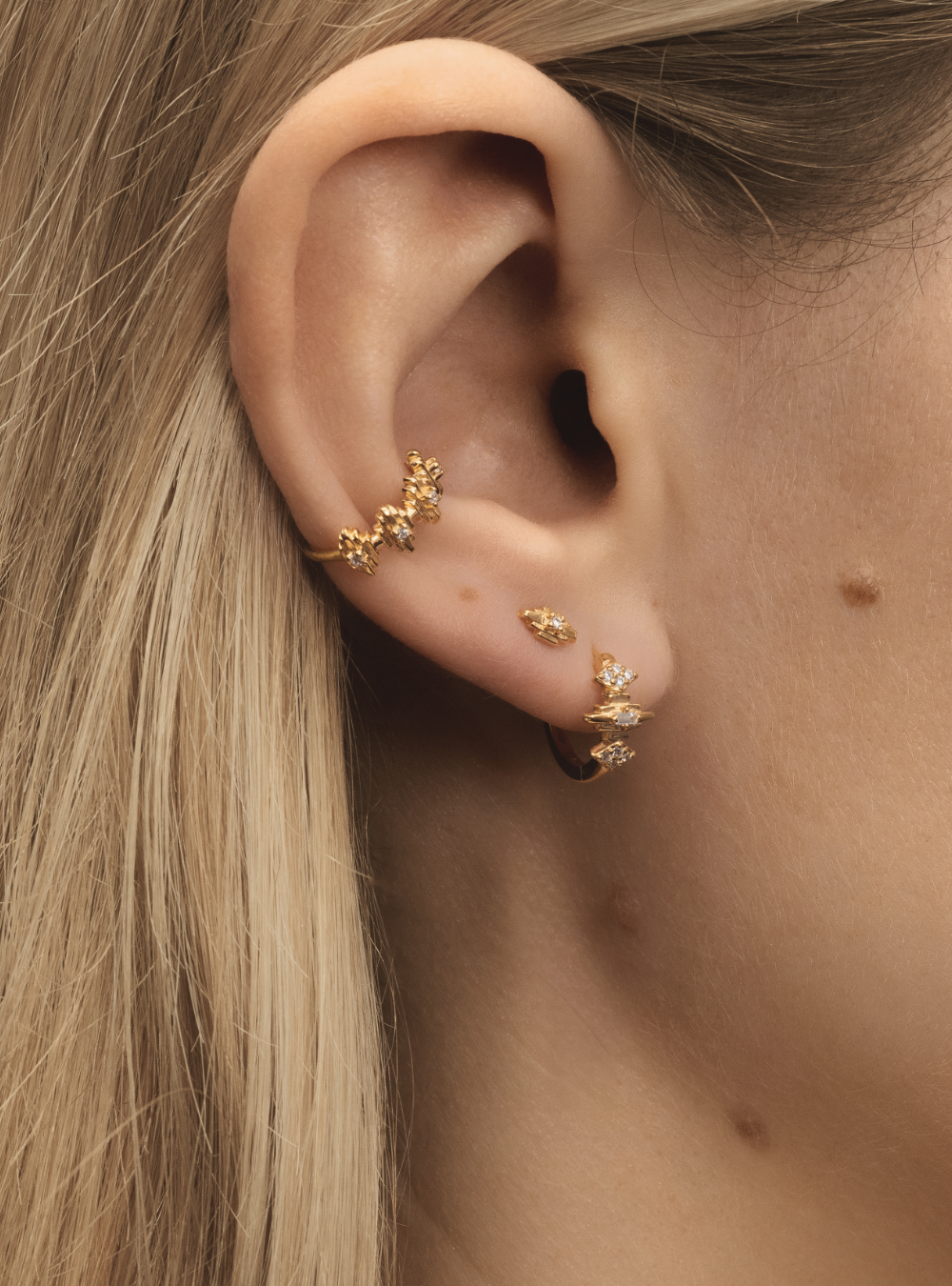 Ear stack featuring one Mada stud, one Ezra hoop, and one Cai earcuff.